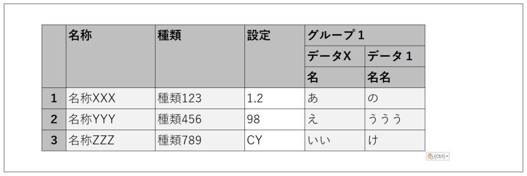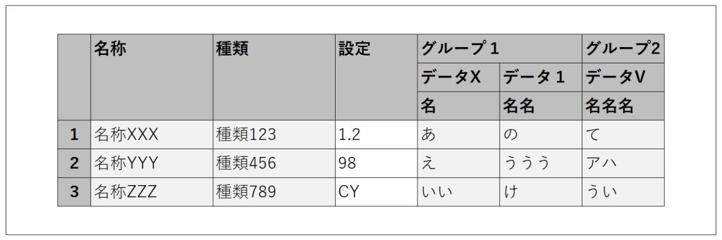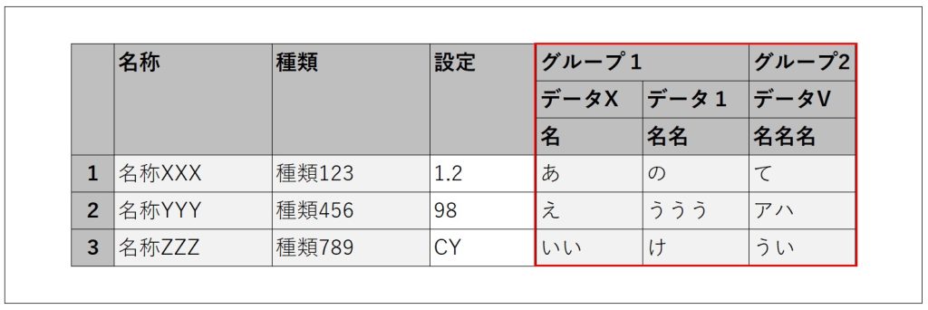The header labels (such as ‘グループ1’, ‘データX’, ‘名名名’, etc.) are dynamic and have already been retrieved in a format that can be passed into JavaScript. (In the sample JavaScript code, these input parts will be shown in bold.)